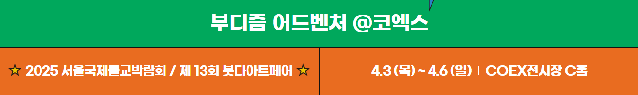 2025년 서울국제불교박람회는 4월 3일(목)부터 4월 6일(일)까지 4일간 코엑스(COEX) C홀에서 개최됩니다. 이번 박람회의 슬로건은 '살아있는 한국전통문화의 꽃'이며, 주제는 '너의 깨달음을 찾아라!(팔정도와 함께) 부디즘 어드벤처@코엑스'입니다.